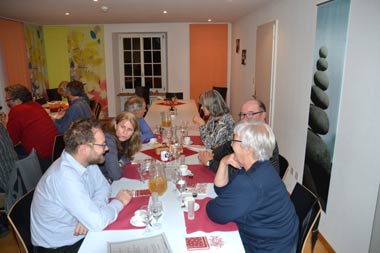 30.10.2015. Mit einem Anlass rund um Wurzelgemüse schloss Slow Food Oberaargau das Jahresprogramm 2015 zum Thema «Perlen aus dem Oberaargauer Terroir» ab. Urs Burch vom Klostergasthaus in St. Urban verzauberte seine Gäste mit einem 5-Gang-Menü mit Wurzelgemüse aus dem Pflanzplätz von Vorstandsmitglied Pia Büchler im Mittelpunkt: Apéro mit Wurzelgemüsedipps, Rüebeli-Suppe mit Gniffe-Dekoration, Herbsträben-Kuchen serviert mit Brunnenkressesalat, Petersilienwurz glaciert mit Honig, Randen-Orangen-Tiramisu und zum Schluss einen Einzianschnaps. Zwischen den Gängen brauchte Markus Meyer-Langenegger die «Früchte der Erde» den Gästen aus Apotheker-Sicht näher. Gleich wie an der Startveranstaltung von Ende Februar in Wangen a.A. begeisterte Musiker Rainer Walker auch an der letzten Veranstaltung mit erdig-tiefgreifenden Klängen, diesmal vom Akkordeon. Slow Food Oberaargau wird die Suche nach regionaltypischen Speisen fortsetzen. Diesbezüglich war der Kuchen mit den für den Oberaargau typischen Herbsträben das Highlight des Abends.