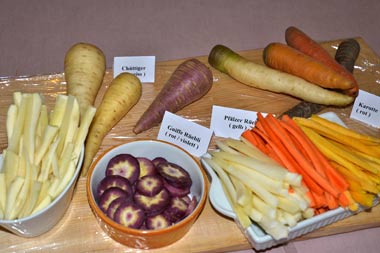 Slow Food-Vorstandsmitglied Pia Büchler zog für den Anlass ein ganzes Sortiment an Wurzelgemüsen heran, beispielsweise verschiedene Karotten.
