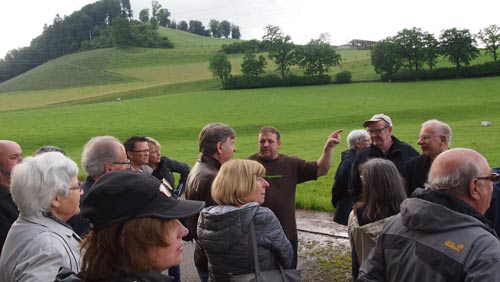 Am Samstag 4. Juni hatten Slow Food Solothurn, Aargau und Oberaargau zu einem Rundgang mit Fokus Rohmilch auf die Agrovision Burgrain (Alberswil LU) eingeladen. Der Geschäftsführer nahm die Gäste zuerst mit in den Melkstand des bereits 30 Mitarbeiter zählenden Bio-Vorzeigehofs. Mit schwachem Vakuum wird hier die Milch gemolken und ohne konventionelle Pumpe in den daneben stehenden Milchanhänger geleitet. Auch der Transport zur Käserei direkt auf dem Hof gestaltet sich sehr schonend. So bleibt die Mikrostruktur der Milch erhalten, Diese ist mit einem faszinierenden Zusammenspiel von Eiweiss, Fett, Enzymen, Milchzucker, Vitaminen usw. übrigens ein wahres Wunder der Natur und ermöglicht gar die Herstellung von Rohmilch-Weichkäse. In der Industrie mit 10-20 Pumpdurchgängen, Homogenisierung, Lagerung usw. wäre das undenkbar. Doch die Rohmilchqualität beginnt laut Lieberherr schon viel früher. Grösstenteils Raufutter von den umliegenden Standweiden, qualitativ hochstehendes Heu für die Winterzeit, optimales Klima im relativ wenig benutzten Stall, und der Verzicht auf Pestizide und synthetische Dünger im Bio-Anbau sind weitere Grundlagen für den Erfolg auf dem Burgrain. Die Slow Food-Mitglieder waren von dieser wegweisenden Führung rund um das wichtige Thema Rohmilch beeindruckt.